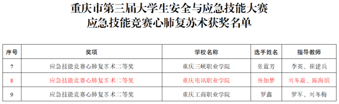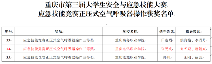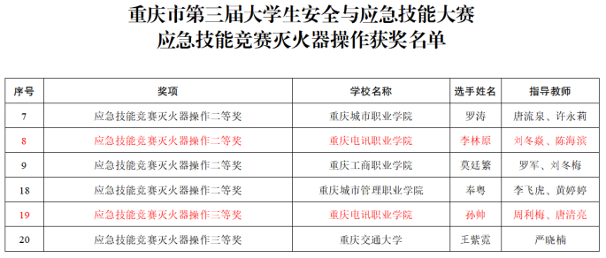 近日,重庆市第三届大学生安全与应急技能大赛各赛项成绩陆续公布,我校在多个赛项中取得优异成绩。我校智慧城市建设学院学生凭借扎实的专业技能和出色的临场表现,荣获应急技能竞赛灭火器操作二等奖、应急技能竞赛正压式空气呼吸器操作三等奖、应急技能竞赛灭火器操作三等奖。