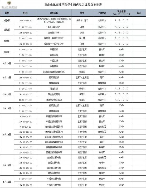 为了实现“实践重知行,合作助成长”这一见习目标,帮助学生深入一线了解酒店行业、岗位工作流程,实现提升学生专业技能、培养符合企业真正需要的高素质优技能酒店管理人才这一最终培养目标,华地王朝酒店人员与我校专业教师经过多次教学研讨为学生安排了酒店产品知识、酒店服务礼仪、消防安全知识、职业生涯规划、酒店星评知识、前厅部SOP、客房部SOP、餐饮部-咖啡厅SOP、餐饮部-中餐厅SOP以及各类酒店实操等与酒店职业工作息息相关的课程。