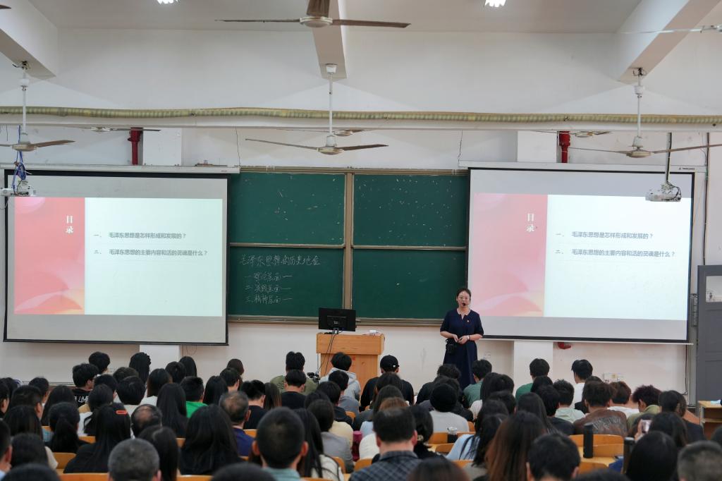 本次活动推荐了基础部裴直老师担任示范课主讲,她以《毛泽东思想和中国特色社会主义理论体系概论》章节为主线,凭借深厚学术底蕴、丰富教学经验和技巧,透过理论、实践、精神三个维度,对“毛泽东思想及其历史地位”相关知识作了生动透彻、深入浅出的阐释和讲解,授课激情饱满,课堂生动风趣,现场氛围浓郁,赢得了在场师生一致好评。